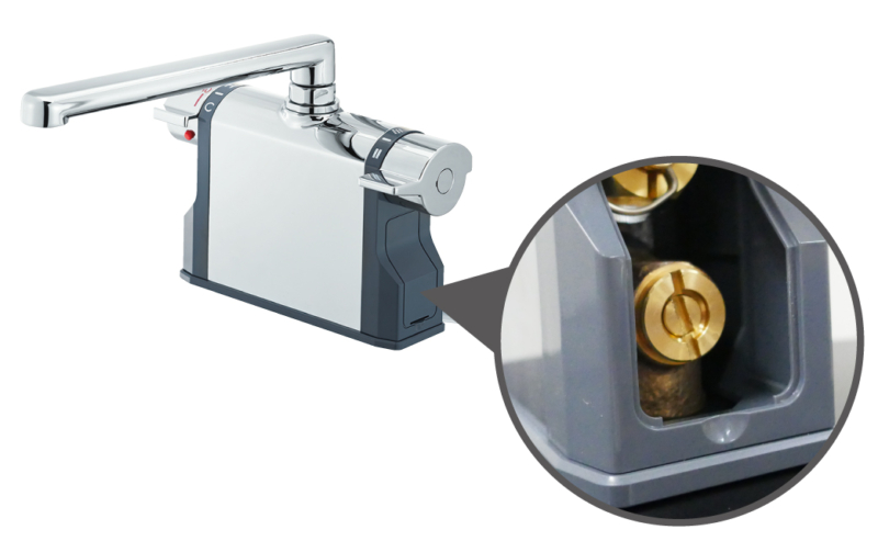 デッキサーモ混合栓の両サイドにはカバーがあり、カバーを開けると流量調整弁とストレーナーが入っており、コインドライバーでメンテナンスが可能です。